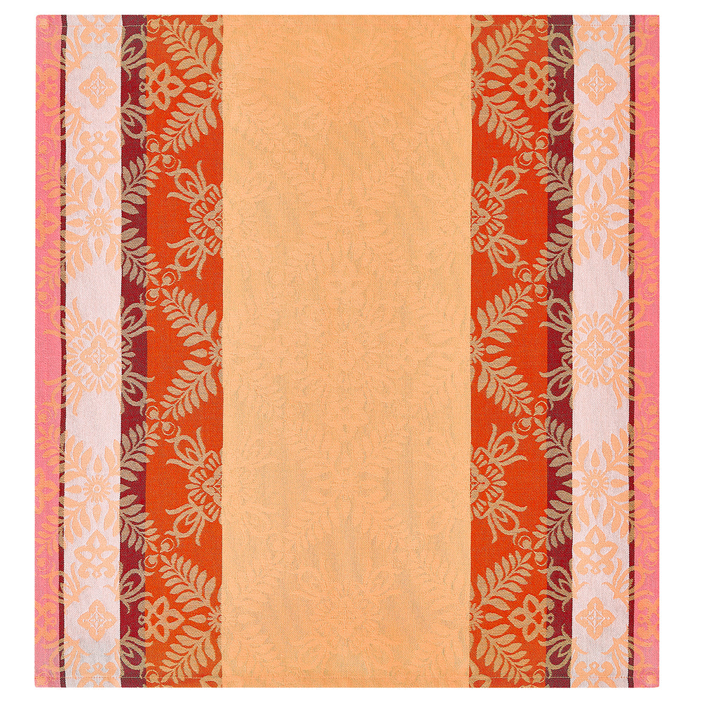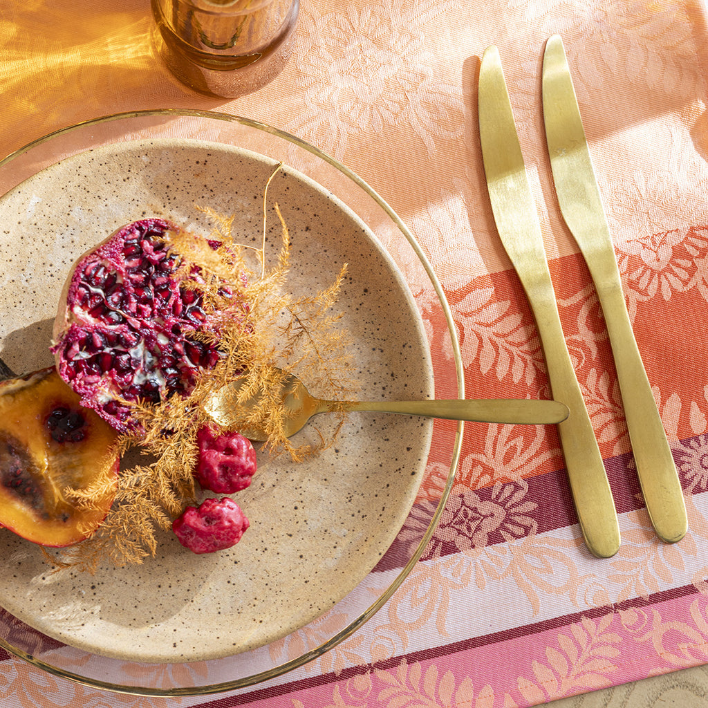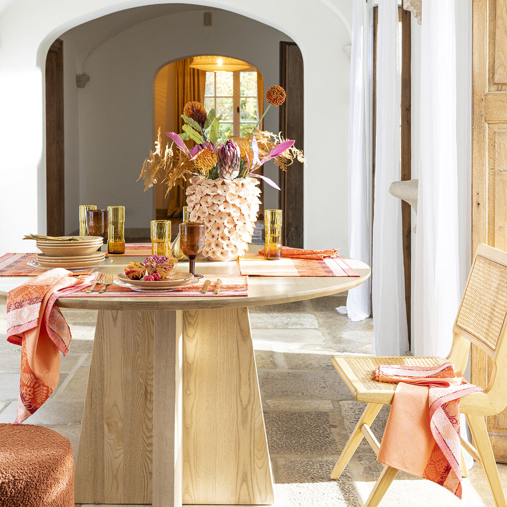 Vibrate to the rhythm of bold colors with the Mumbai collection by Le Jacquard Français. This season, let yourself be carried away to the heart of a reinvented India, where the ornaments of palaces unfold infinitely. Gourmet and spicy tables come to life with patterns such as pomegranates, pineapples, and lotus hearts, intertwined with lush foliage. The Mumbai collection harmoniously blends traditions, vibrant and enchanting colors.