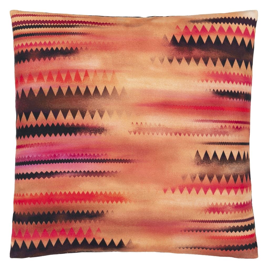 Rich and bold tubular geometric shapes, cleverly tiled together in deep magenta and red tones are heavily embroidered in contrast with the black ground. This statement interior decorative pillow by Christian Lacroix for Designers Guild reverses to a digitally printed graphic pattern on sleek cotton satin.