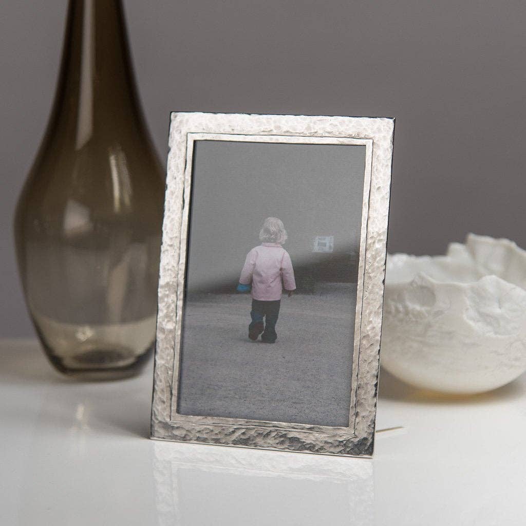 Handmade cast pewter photo frame. Our Thurlestone design evokes the surface of the sea and the beach. By using a narrow profile, this design has a more classic proportion. This photo frame can be displayed either portrait or landscape.