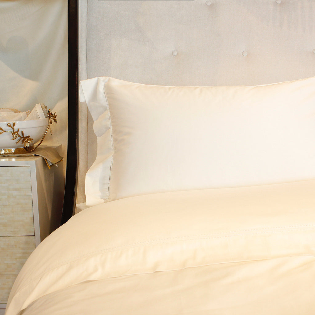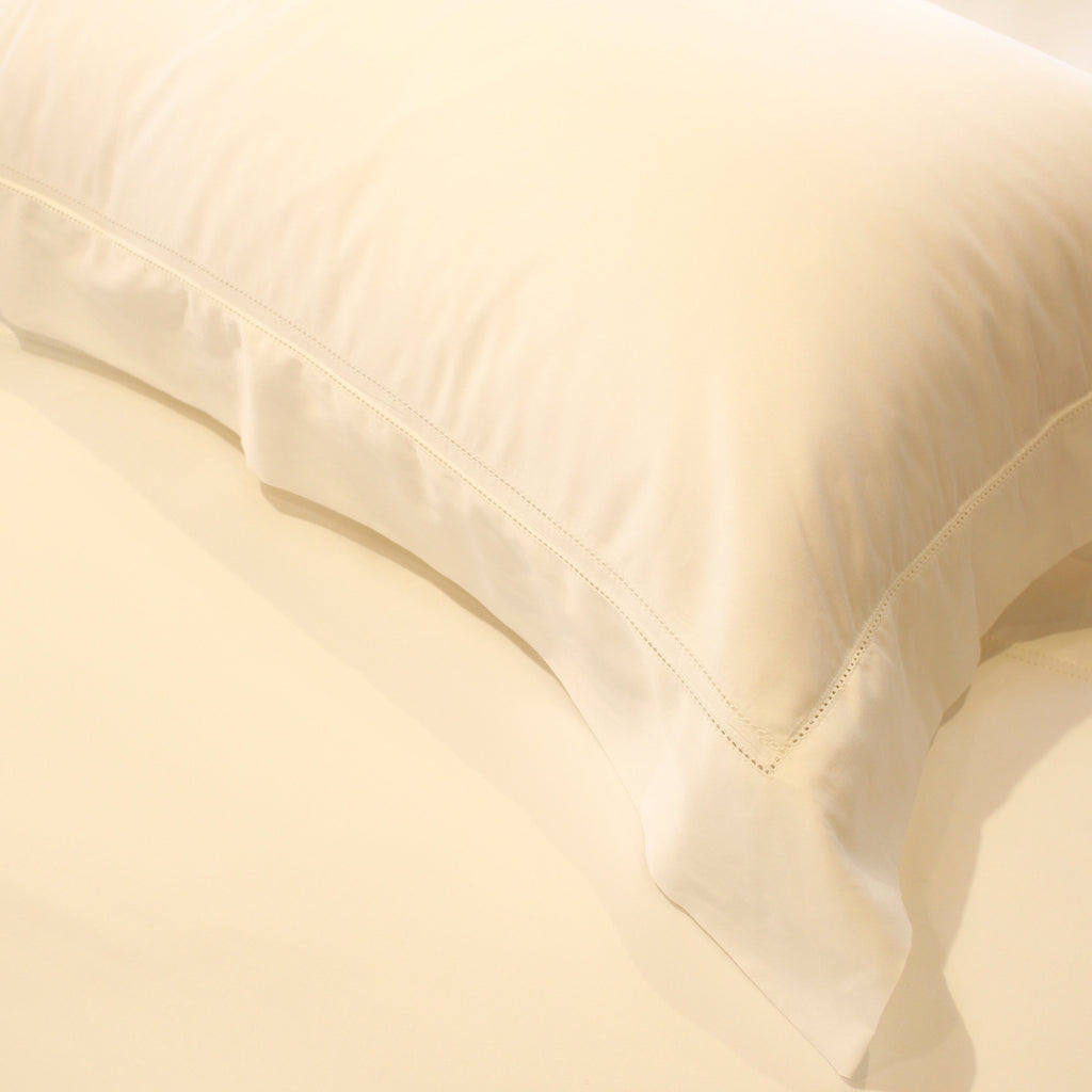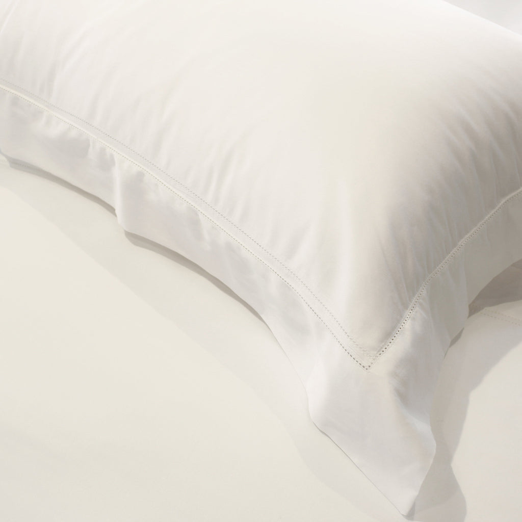- have a mitered flange and an envelope closure with hemstitching. The top edge features a double row of hemstitching as an additional accent.